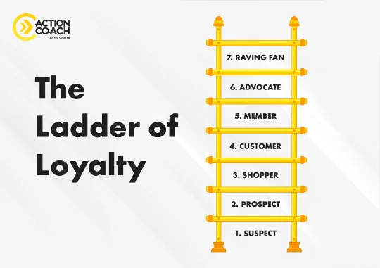 A somar à Fórmula dos 5 Multiplicadores, temos a Escada de Lealdade ABoS, que o acompanhará na criação de um sistema que transforma um Suspeito (alguém do seu mercado-alvo) num Fã Entusiasta — alguém que compra repetidamente, recomenda clientes semelhantes e publica nas redes sociais, gerando-lhe mais negócios.